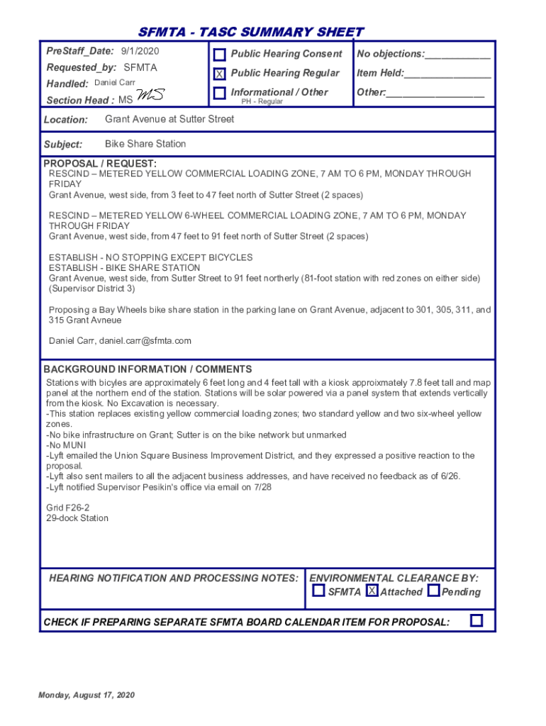 SF MTA TASK SUMMARY SHEET Restaff_Date: 9/1/2020 Requested_by: SF MTA Handled: Daniel Carr Section Head : Public Hearing Consent No objections:___X Public Hearing Regularity Held:___Informational
