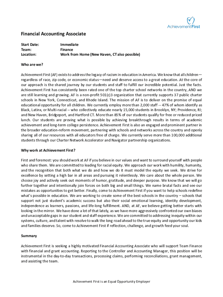 Financial Accounting Associate Start Date: Team: Location:Immediate Finance Work from Home (New Haven, CT also possible)Who are we? Achievement First (AF) exists to address the legacy of racism in