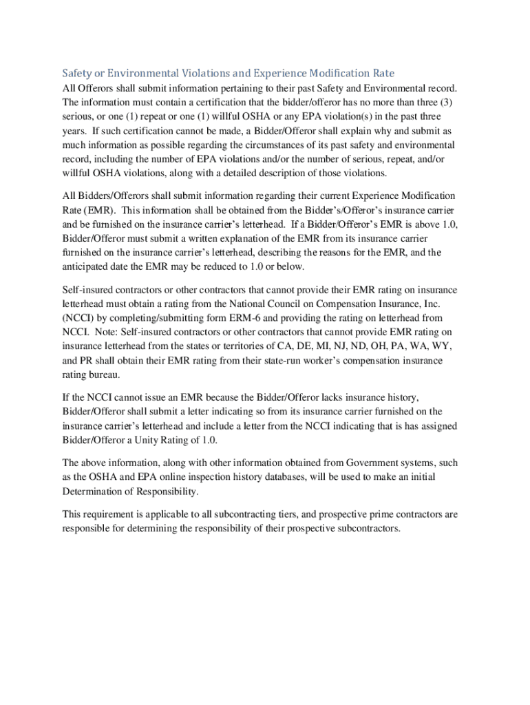 Safety or Environmental Violations and Experience Modification Rate All Offers shall submit information pertaining to their past Safety and Environmental record. The information must contain a certification