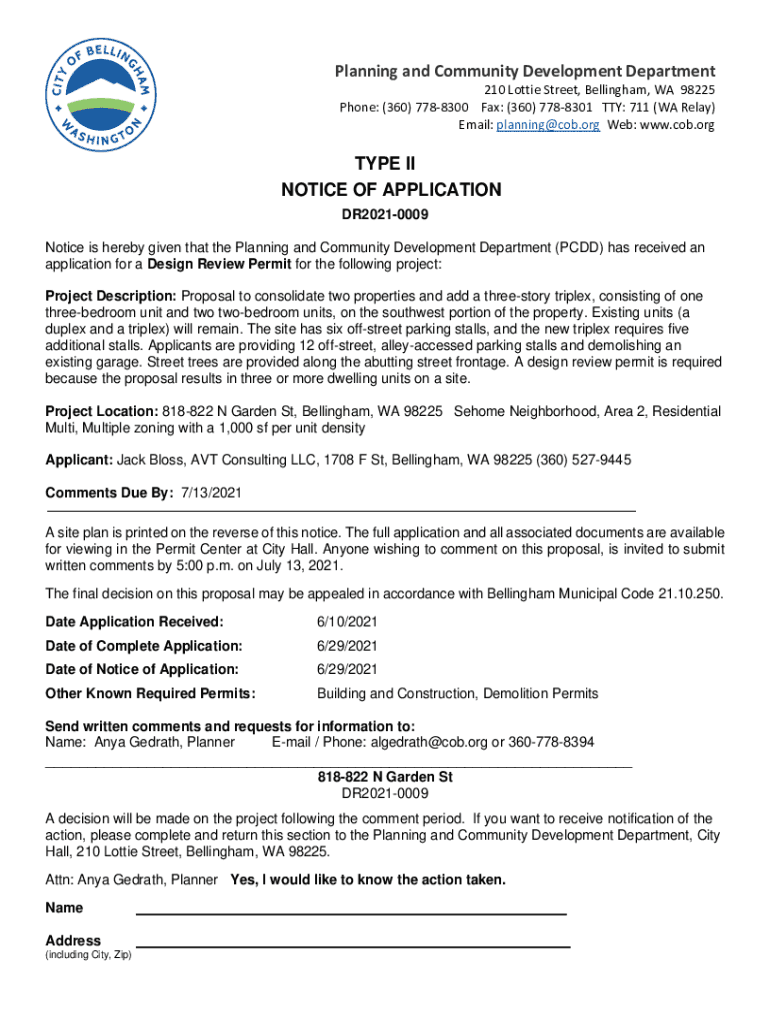 Planning and Community Development Department 210 Lottie Street, Bellingham, WA 98225 Phone: (360) 7788300 Fax: (360) 7788301 TTY: 711 (WA Relay) Email: planning@cob.org Web: www.cob.orgTYPE II NOTICE