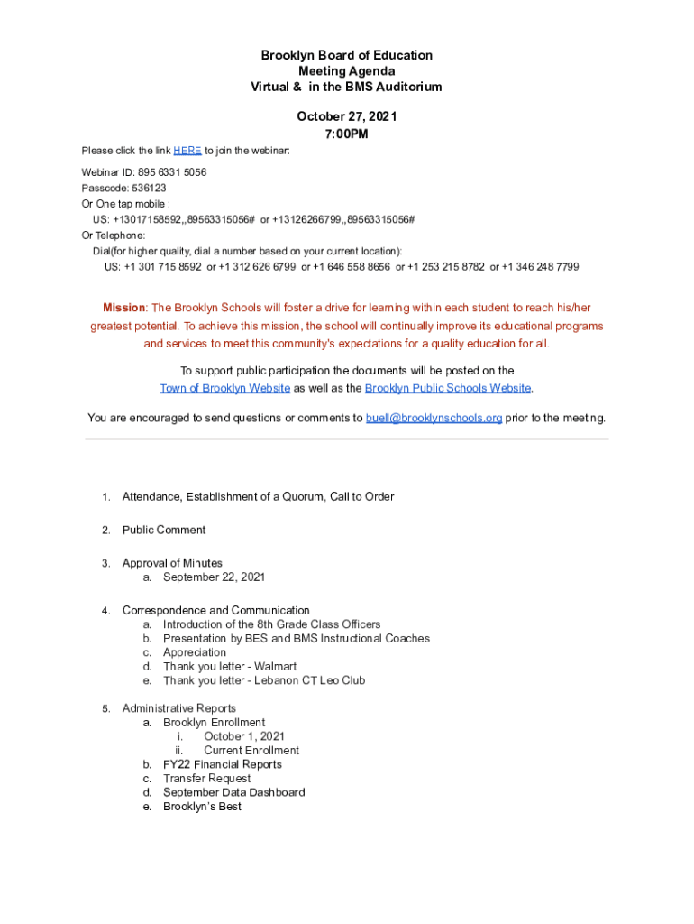 Brooklyn Board of Education Meeting Agenda Virtual & in the BMS Auditorium October 27, 2021 7:00PM Please click the link HERE to join the webinar: Webinar ID: 895 6331 5056 Passcode: 536123 Or One