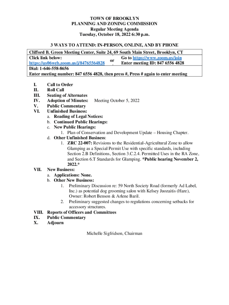 TOWN OF BROOKLYN PLANNING AND ZONING COMMISSION Regular Meeting Agenda Tuesday, October 18, 2022 6:30 p.m. 3 WAYS TO ATTEND: UNPERSON, ONLINE, AND BY PHONE Clifford B. Green Meeting Center, Suite