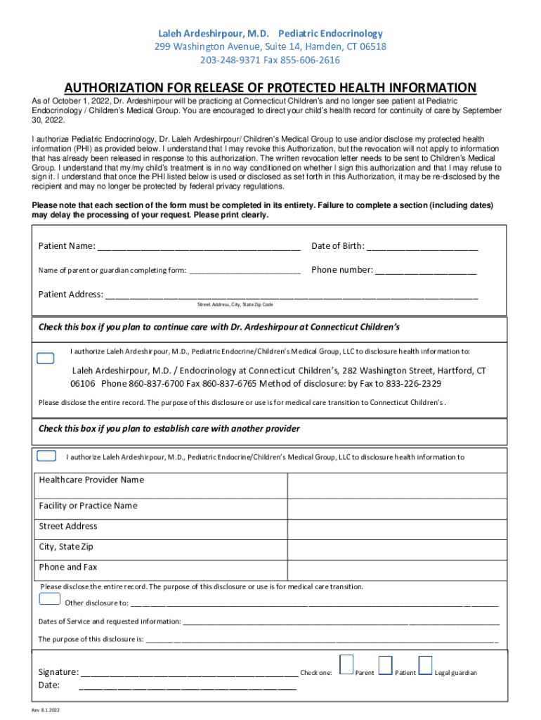 Later Ardeshirpour, M.D. Pediatric Endocrinology 299 Washington Avenue, Suite 14, Hamden, CT 06518 2032489371 Fax 8556062616AUTHORIZATION FOR RELEASE OF PROTECTED HEALTH INFORMATION As of October