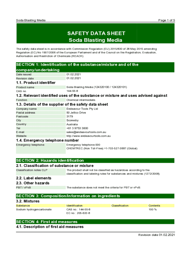 Soda Blasting Media Page 1 of 5SAFETY DATA SHEET Soda Blasting Media The safety data sheet is in accordance with Commission Regulation (EU) 2015/830 of 28 May 2015 amending Regulation (EC) No 1907/2006