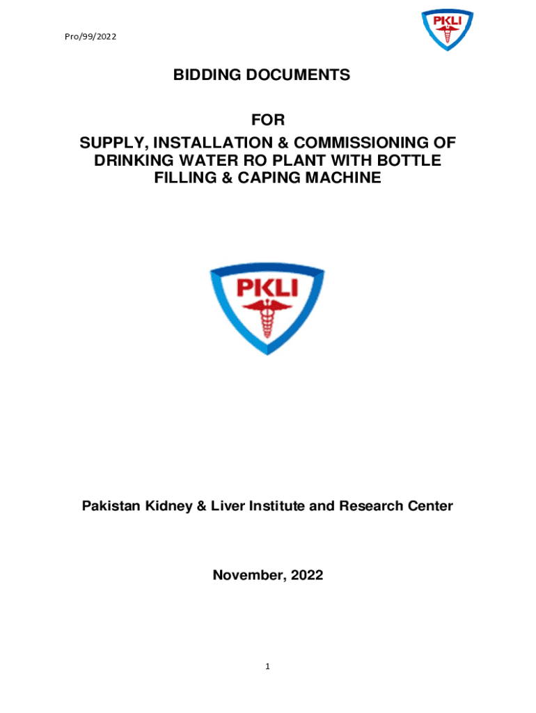 Pro/99/2022BIDDING DOCUMENTS FOR SUPPLY, INSTALLATION & COMMISSIONING OF DRINKING WATER RO PLANT WITH BOTTLE FILLING & CAPING MACHINE Pakistan Kidney & Liver Institute and Research Center November,