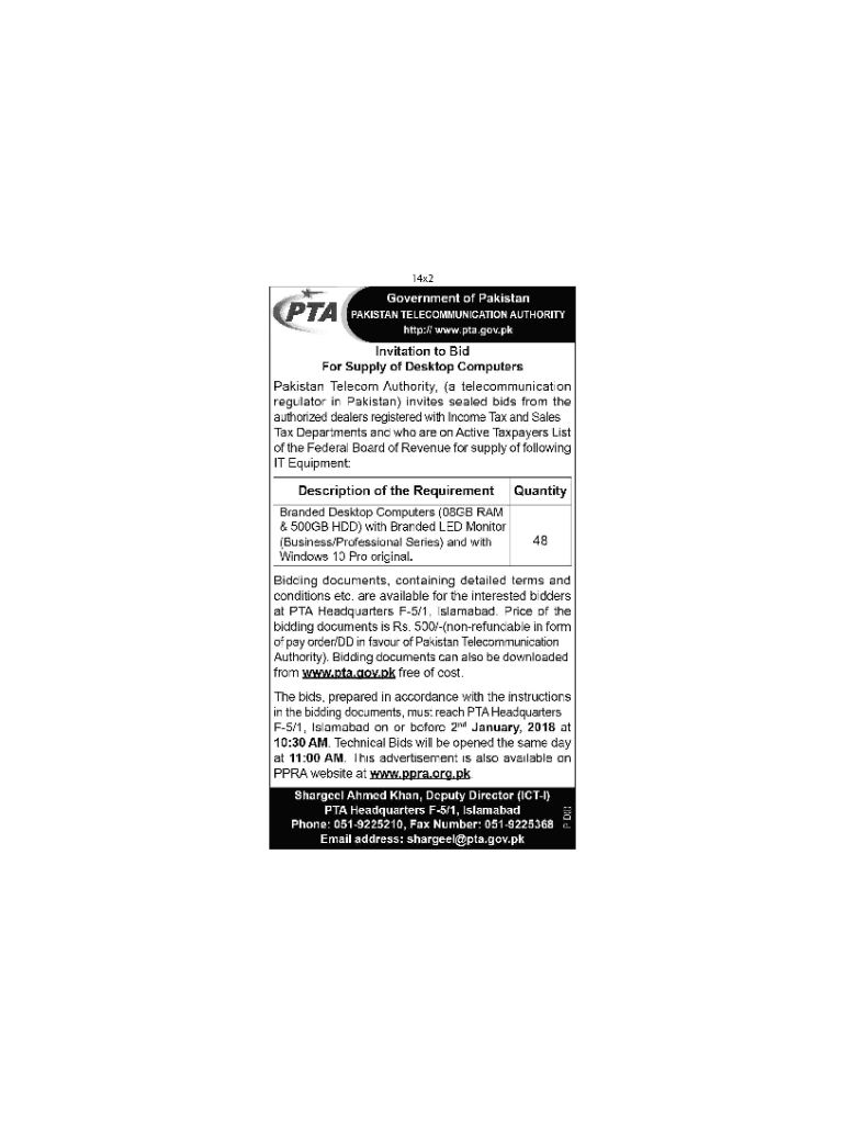 Government of PakistanPAKISTAN TELECOMMUNICATION AUTHORITY HEADQUARTERS F5/1, ISLAMABAD. HTTP// www.pta.gov.pk BIDDING DOCUMENTS Sealed bids are invited from well reputed authorized dealers, having