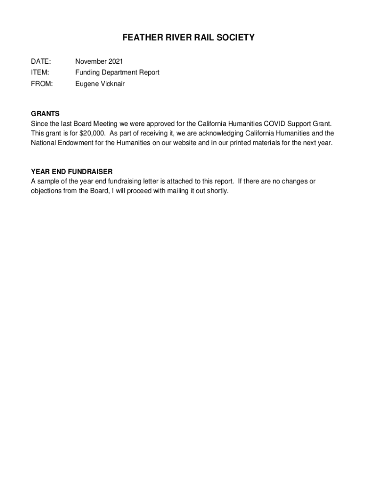 FEATHER RIVER RAIL SOCIETY DATE:November 2021ITEM:Funding Department Reporter:Eugene VicknairGRANTS Since the last Board Meeting we were approved for the California Humanities COVID-19 Support Grant.