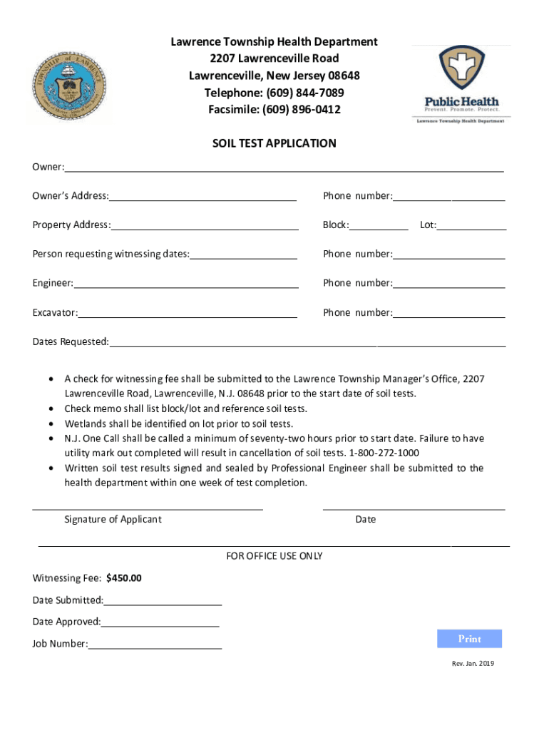 Lawrence Township Health Department 2207 Lawrenceville Road Lawrenceville, New Jersey 08648 Telephone: (609) 8447089 Facsimile: (609) 8960412 SOIL TEST APPLICATION Owner:___ Owners Address:___Phone