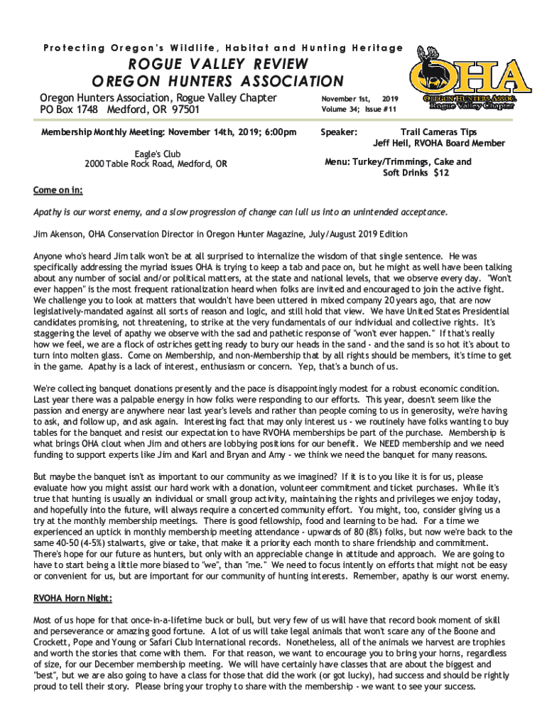 Protecting Oregon's Wildlife, Habitat and Hunting Heritage O GUE V A L LED R E VIE W O R E G ON H UN TER S A S OCI A TO Oregon Hunters Association, Rogue Valley Chapter PO Box 1748 Medford, OR 97501November