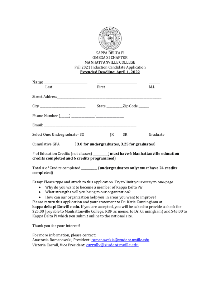 KAPPA DELTA PI OMEGA XI CHAPTER MANHATTANVILLE COLLEGE Fall 2021 Induction Candidate Application Extended Deadline: April 1, 2022Name ___ Last___ First___ M.I. Street Address___ City ___State ___