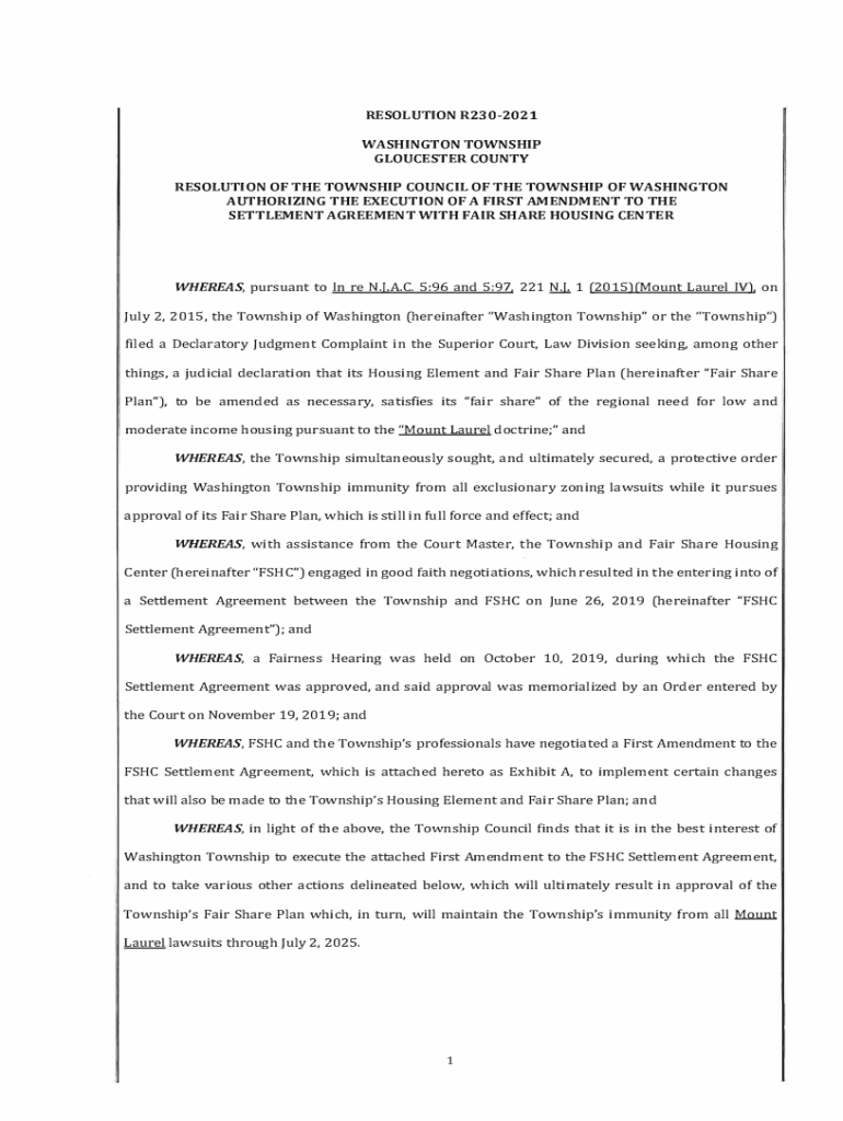 RESOLUTION OF THE TOWNSHIP COUNCIL OF THE TOWNSHIP OF WASHINGTON