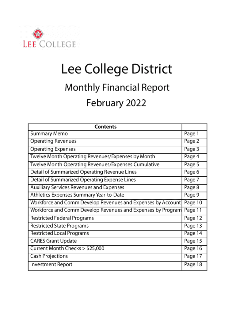 Lee College District Monthly Financial Report February 2022 Contents Summary Memo Operating Revenues Operating Expenses Twelve Month Operating Revenues/Expenses by Month Twelve Month Operating Revenues/Expenses