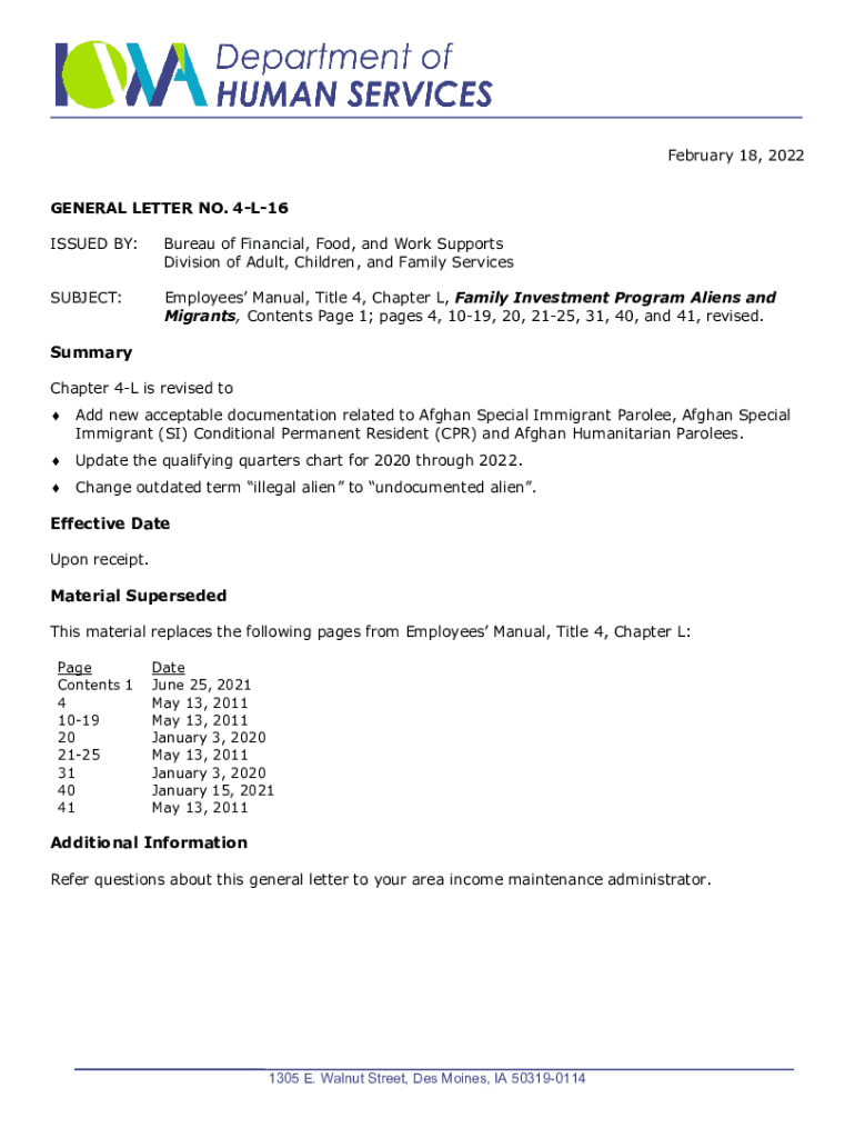 February 18, 2022, GENERAL LETTER NO. 4L16 ISSUED BY:Bureau of Financial, Food, and Work Supports Division of Adult, Children, and Family ServicesSUBJECT:Employees Manual, Title 4, Chapter L, Family