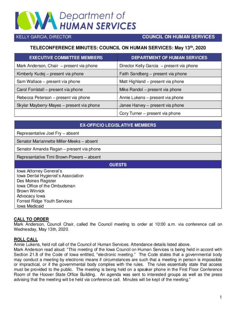 COUNCIL ON HUMAN SERVICESKELLY GARCIA, DIRECTORTELECONFERENCE MINUTES: COUNCIL ON HUMAN SERVICES: May 13th, 2020 EXECUTIVE COMMITTEE MEMBERSDEPARTMENT OF HUMAN SERVICES Mark Anderson, Chair present