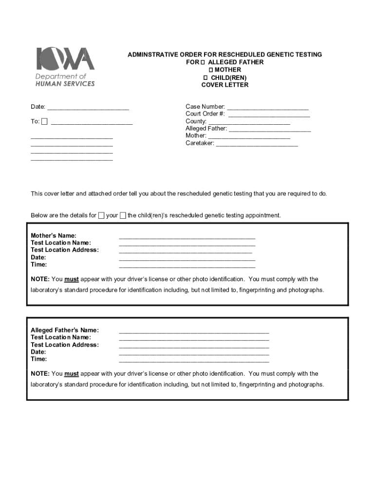 ADMINISTRATIVE ORDER FOR RESCHEDULED GENETIC TESTING FOR ALLEGED FATHER MOTHER CHILD(MEN) COVER LETTER Date: ___ To: ___ ___ ___ ___ ___Case Number: ___ Court Order #: ___ County: ___ Alleged Father: