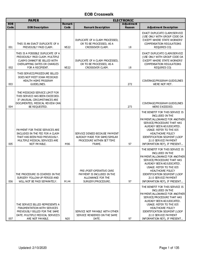 EOB Crosswalk PAPER EOB Code DescriptionELECTRONIC Remark CodeRemark DescriptionDUPLICATE OF A CLAIM PROCESSED, OR TO BE PROCESSED, AS A CROSSOVER CLAIM. Adjustment ReasonAdjustment Description18EXACT