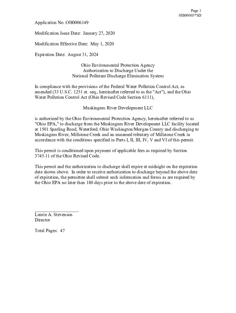 Page 1 0IB00003×Application No. OH0006149 Modification Issue Date: January 27, 2020, Modification Effective Date: May 1, 2020, Expiration Date: August 31, 2024 Ohio Environmental Protection Agency