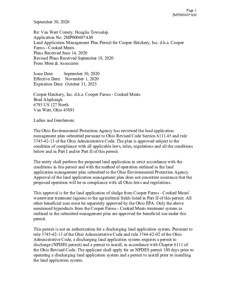 Page 1 2MP00048×AM September 30, 2020, Re: Van Were County, Hamlin Township Application No. 2MP00048×AM Land Application Management Plan Permit for Cooper Hatchery, Inc. d.b.a. Cooper Farms Cooked