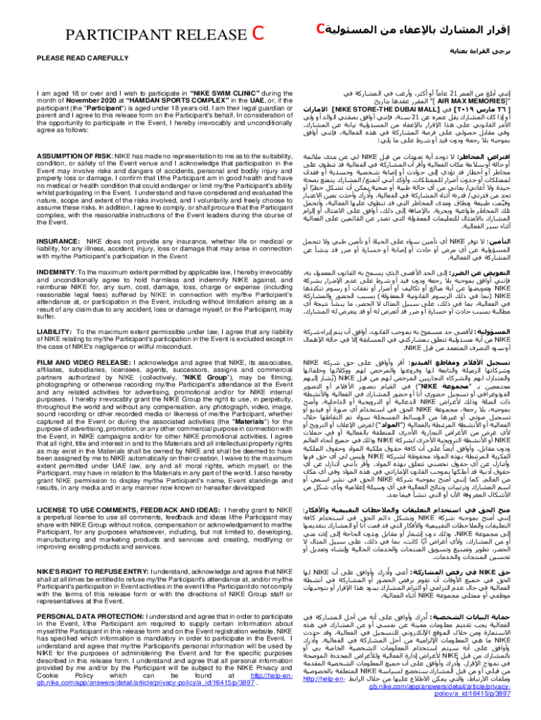 PARTICIPANT RELEASE CC PLEASE READ CAREFULLY am aged 18 or over and I wish to participate in NIKE SWIM CLINIC during the month of November 2020 at HAMAN SPORTS COMPLEX in the UAE, or, if the participant