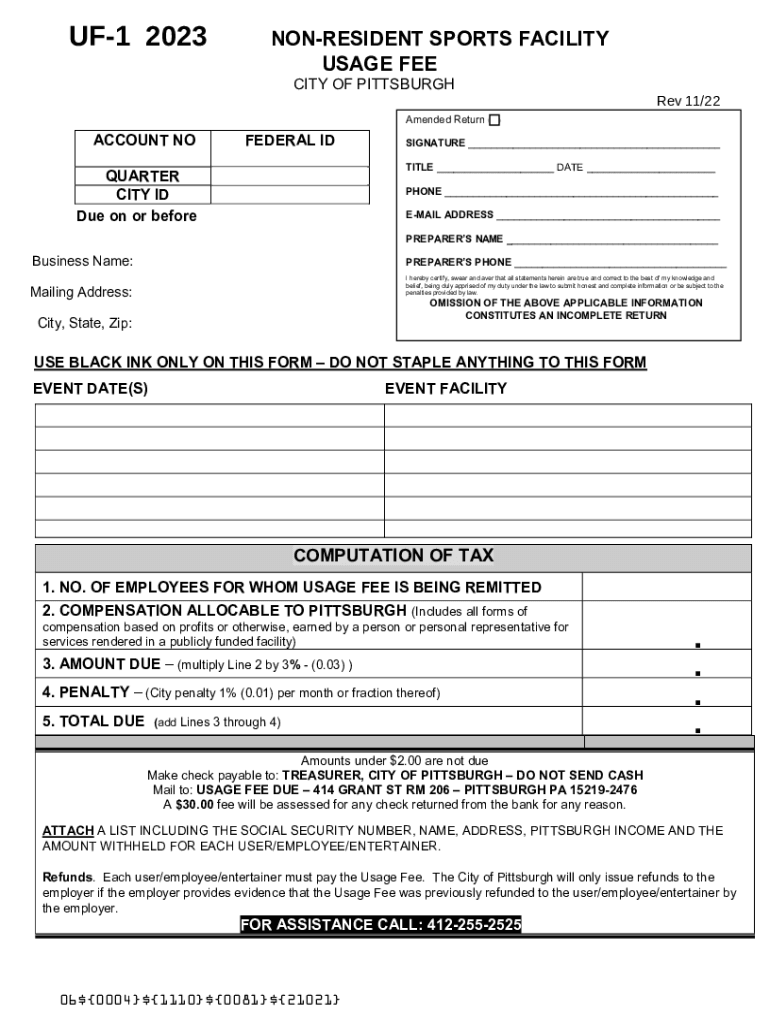 UF1 2023NONRESIDENT SPORTS FACILITY USAGE FEE CITY OF Pittsburgh 11/22Amended Return ()ACCOUNT FEDERAL SIGNATURE ___ TITLE ___ DATE ___QUARTER CITY ID Due on or beforehand ___ EMAIL ADDRESS ___ PREPARERS