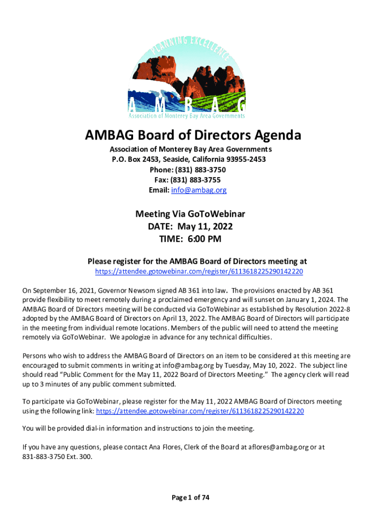 AMONG Board of Directors Agenda Association of Monterey Bay Area Governments P.O. Box 2453, Seaside, California 939552453 Phone: (831) 8833750 Fax: (831) 8833755 Email: info@ambag.orgMeeting Via GoToWebinar
