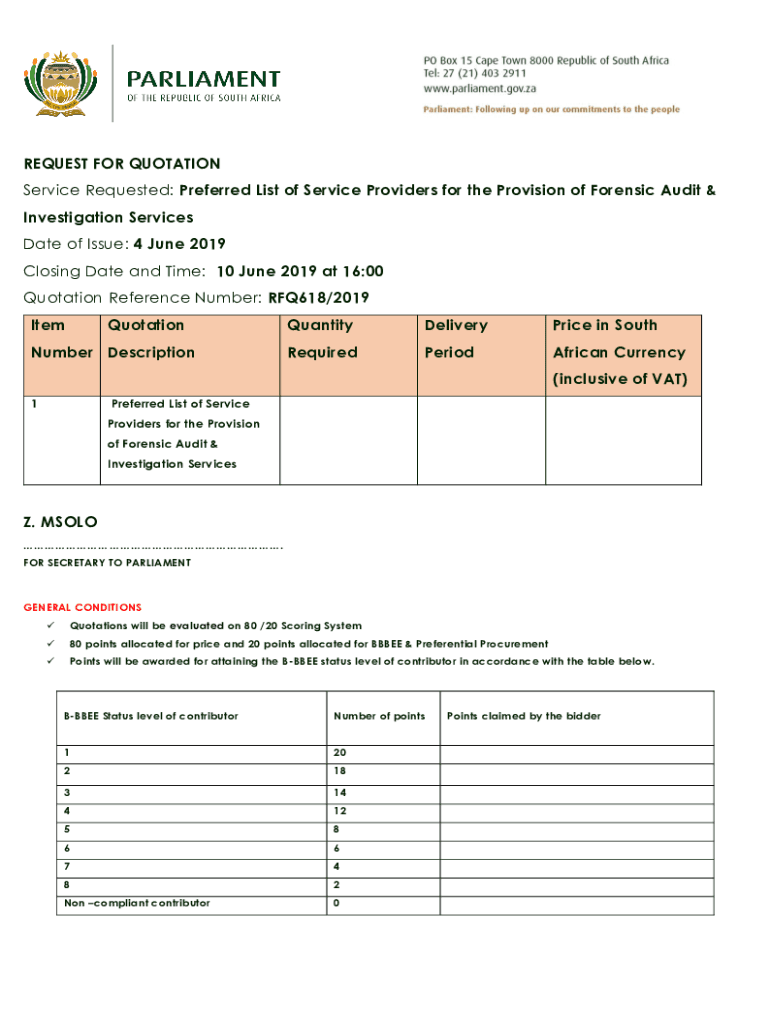 REQUEST FOR QUOTATION Service Requested: Preferred List of Service Providers for the Provision of Forensic Audit & Investigation Services Date of Issue: 4 June 2019 Closing Date and Time: 10 June
