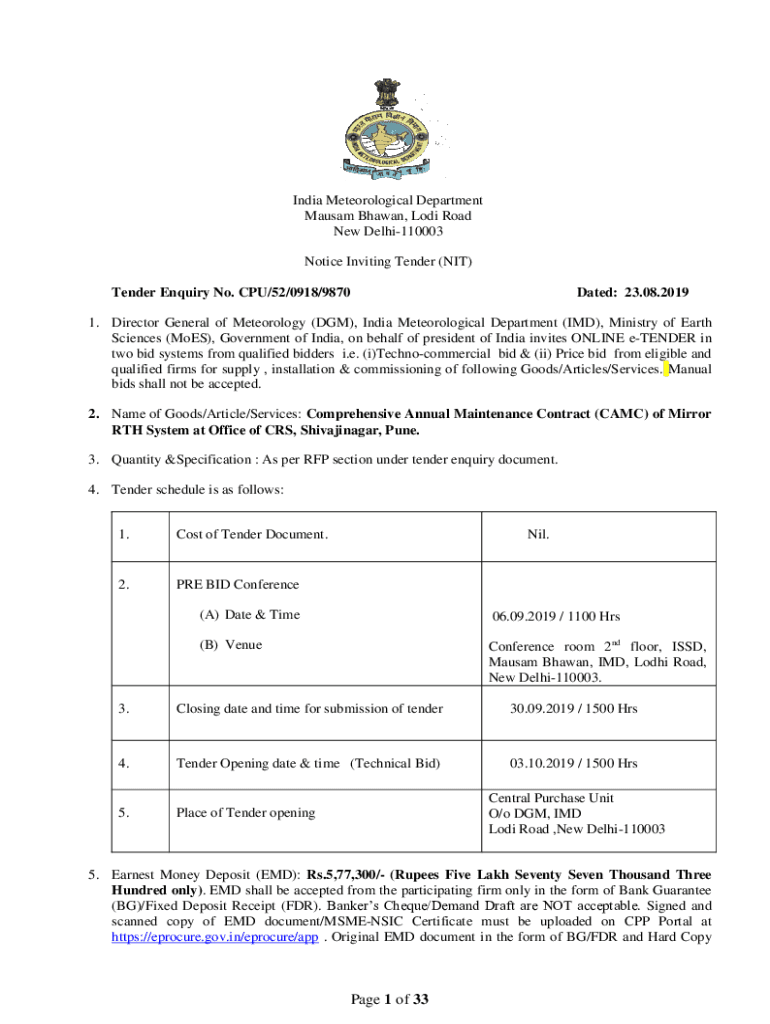 India Meteorological Department Assam Shawn, Lodi Road New Delhi110003 Notice Inviting Tender (NIT) Tender Inquiry No. CPU/52/0918/9870Dated: 23.08.20191. Director General of Meteorology (DAM), India
