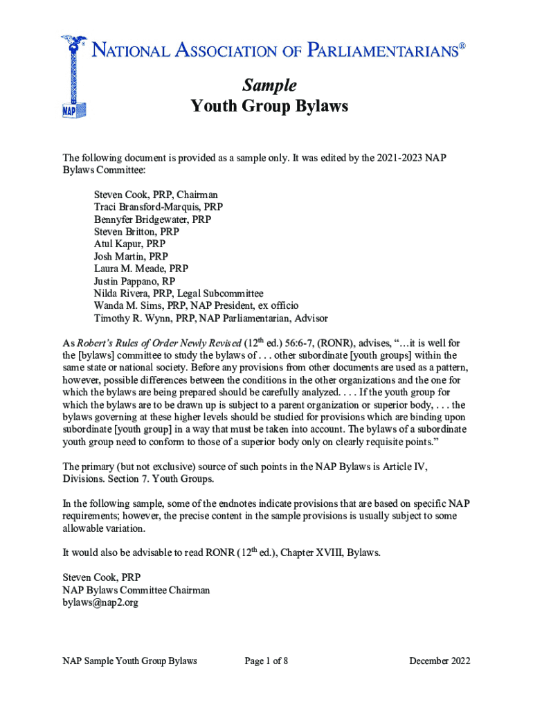Sample Youth Group Bylaws The following document is provided as a sample only. It was edited by the 20212023 NAP Bylaws Committee: Steven Cook, PRP, Chairman Traci BransfordMarquis, PRP Benny fer