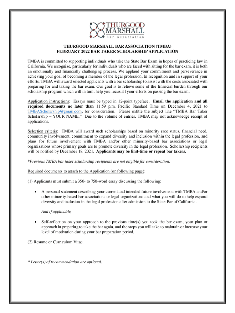 THURGOOD MARSHALL BAR ASSOCIATION (TUBA) FEBRUARY 2022 BAR TAKER SCHOLARSHIP APPLICATION TUBA is committed to supporting individuals who take the State Bar Exam in hopes of practicing law in California.