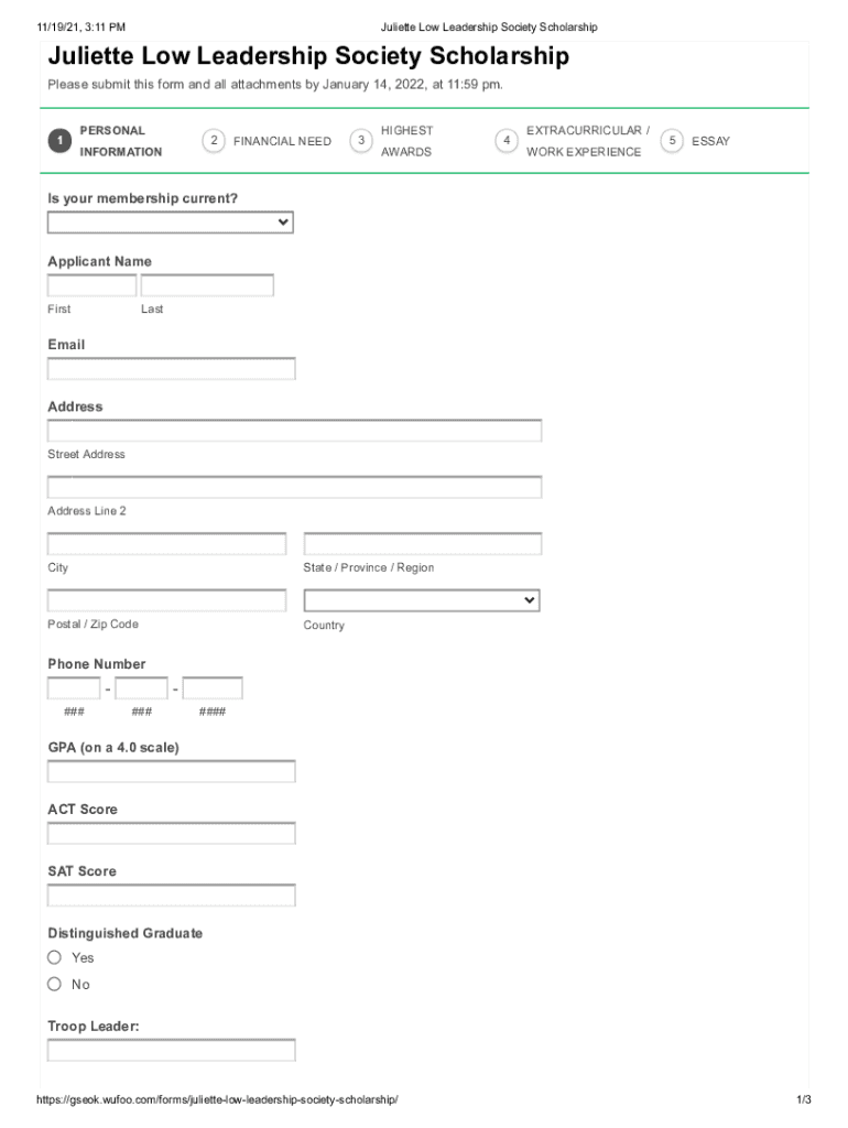 11/19/21, 3:11 PM Juliette Low Leadership Society Scholarship Juliette Low Leadership Society Scholarship Please submit this form and all attachments by January 14, 2022, at 11:59 pm. PERSONAL12INFORMATIONFINANCIAL