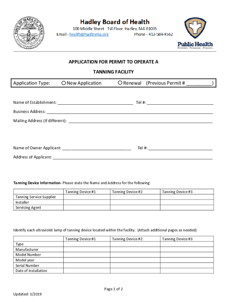 APPLICATION FOR PERMIT TO OPERATE A TANNING FACILITY Application Type:New ApplicationRenewal (Previous Permit # ___)Name of Establishment: ___ Tel #: ___ Business Address: ___ Mailing Address (If