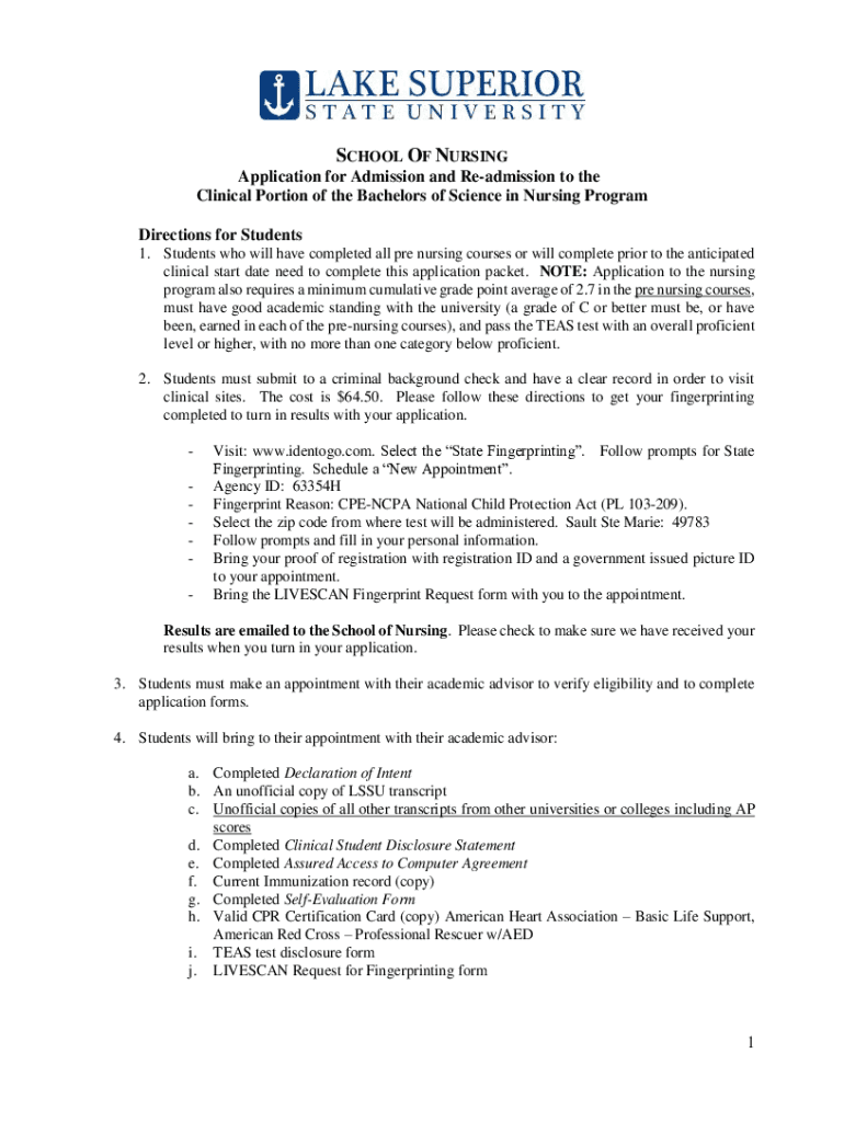 SCHOOL OF NURSING Application for Admission and Readmission to the Clinical Portion of the Bachelors of Science in Nursing Program Directions for Students 1. Students who will have completed all PRE