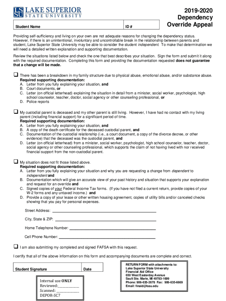 Student Named #20192020 Dependency Override AppealProviding self-sufficiency and living on your own are not adequate reasons for changing the dependency status. However, if there is an unintentional,