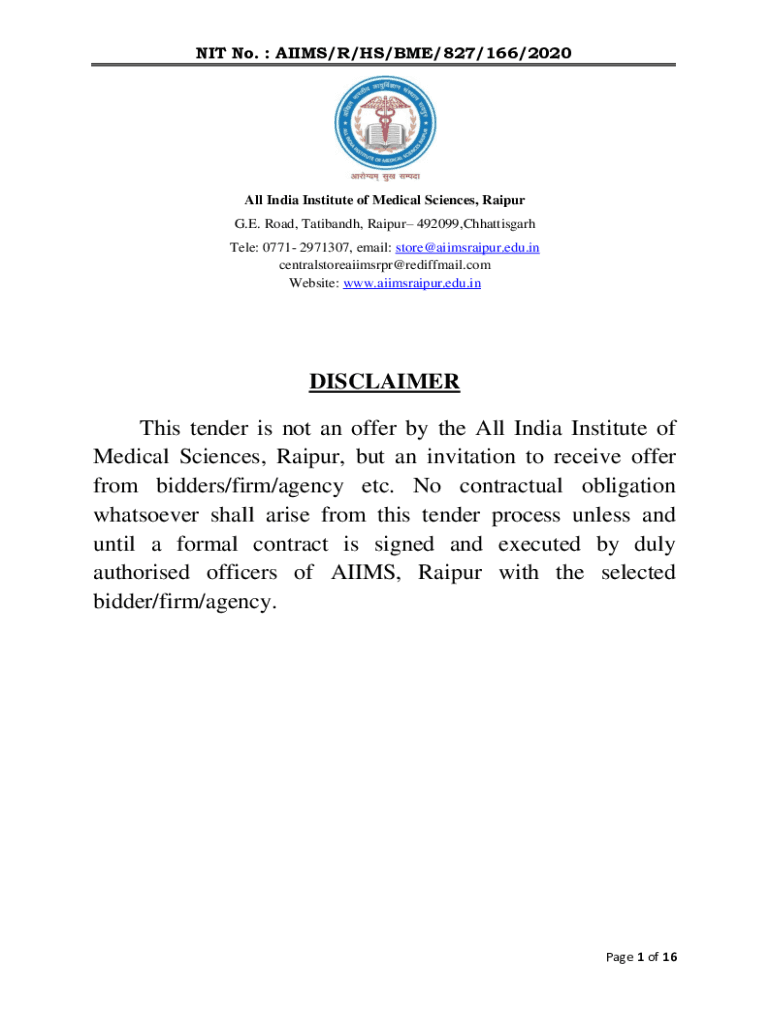 NIT No. AIMS/R/HS/BME/827/166/2020All India Institute of Medical Sciences, Raipur G.E. Road, Taliban, Raipur 492099,Chhattisgarh Tell: 0771 2971307, email: store@aiimsraipur.edu.in centralstoreaiimsrpr@rediffmail.com