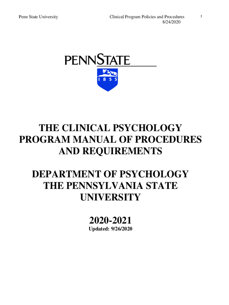 Penn State UniversityClinical Program Policies and Procedures 8/24/20201THE CLINICAL PSYCHOLOGY PROGRAM MANUAL OF PROCEDURES AND REQUIREMENTS DEPARTMENT OF PSYCHOLOGY THE PENNSYLVANIA STATE UNIVERSITY
