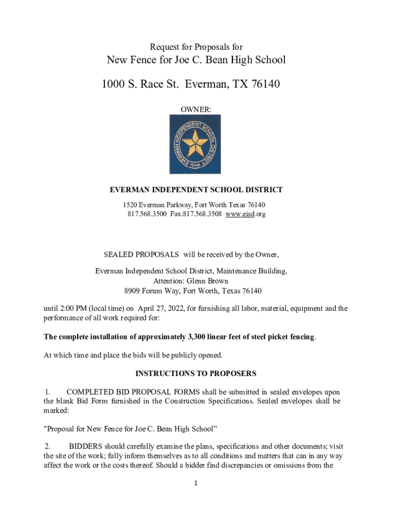 Request for Proposals former Fence for Joe C. Bean High School1000 S. Race St. Ever man, TX 76140 OWNER:GERMAN INDEPENDENT SCHOOL DISTRICT 1520 Ever man Parkway, Fort Worth Texas 76140 817.568.3500