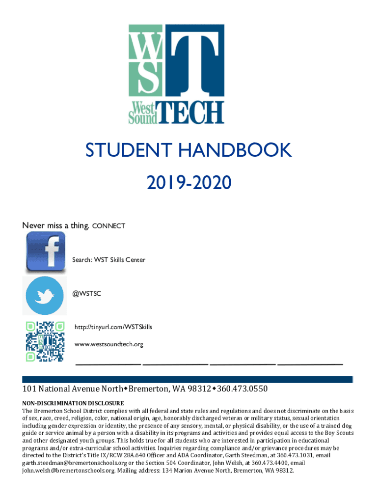 STUDENT HANDBOOK 20192020 Never miss a thing. CONNECTSearch: WST Skills Center@WSTSChttp://tinyurl.com/WSTSkills www.westsoundtech.org101 National Avenue North Bremerton, WA 98312360.473.0550 NONDISCRIMINATION