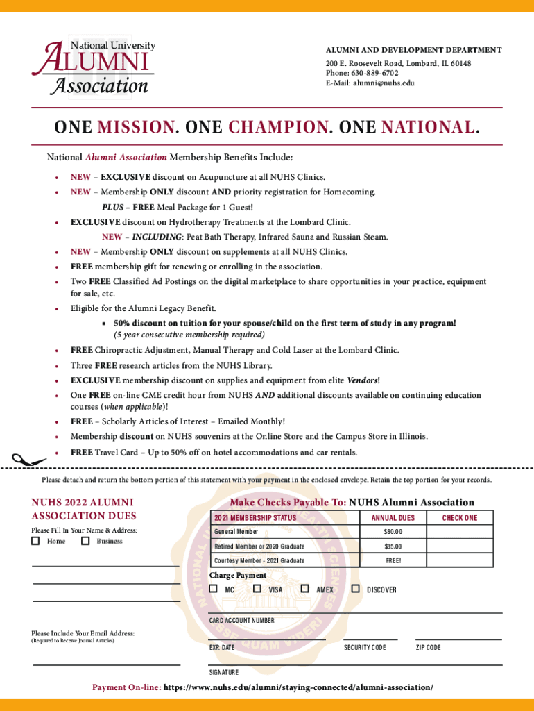Association Multinational UniversityALUMNI AND DEVELOPMENT DEPARTMENT 200 E. Roosevelt Road, Lombard, IL 60148 Phone: 6308896702 Email: alumni@nuhs.eduONE MISSION. ONE CHAMPION. ONE NATIONAL. National