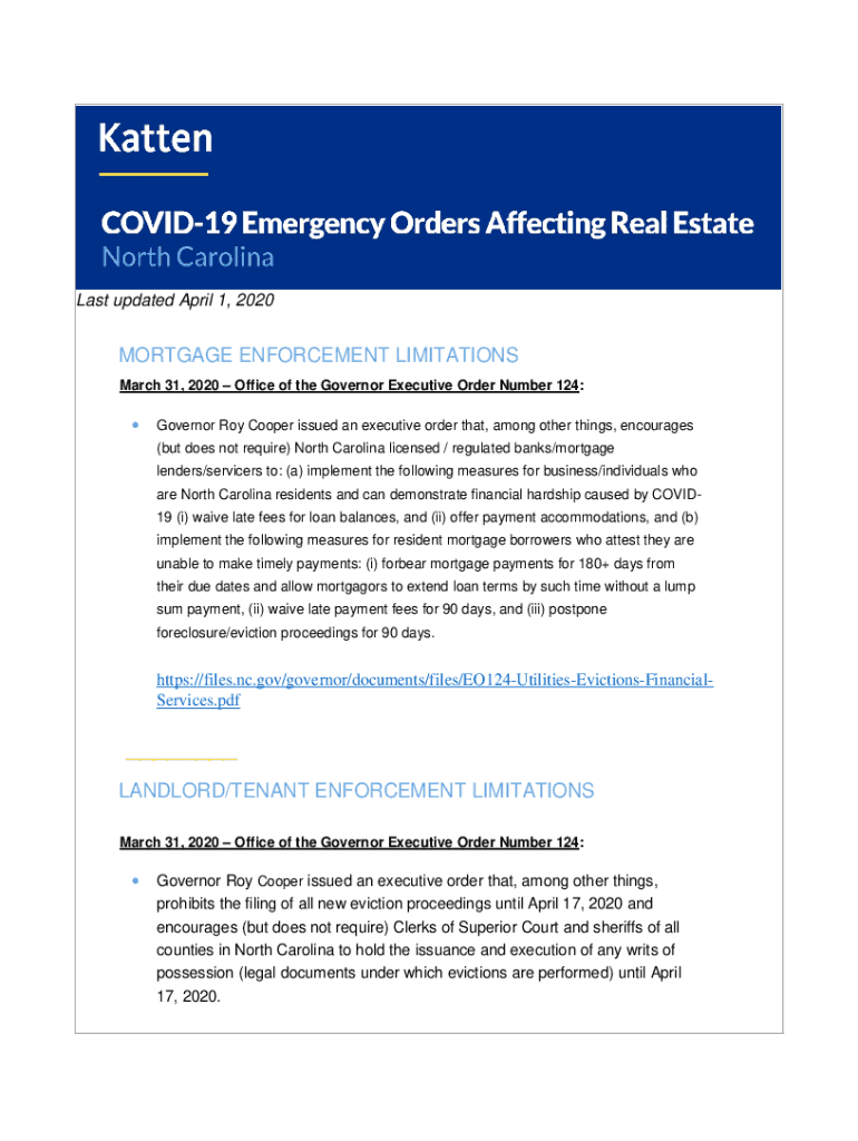 Last updated April 1, 2020MORTGAGE ENFORCEMENT LIMITATIONS March 31, 2020, Office of the Governor Executive Order Number 124:Governor Roy Cooper issued an executive order that, among other things,