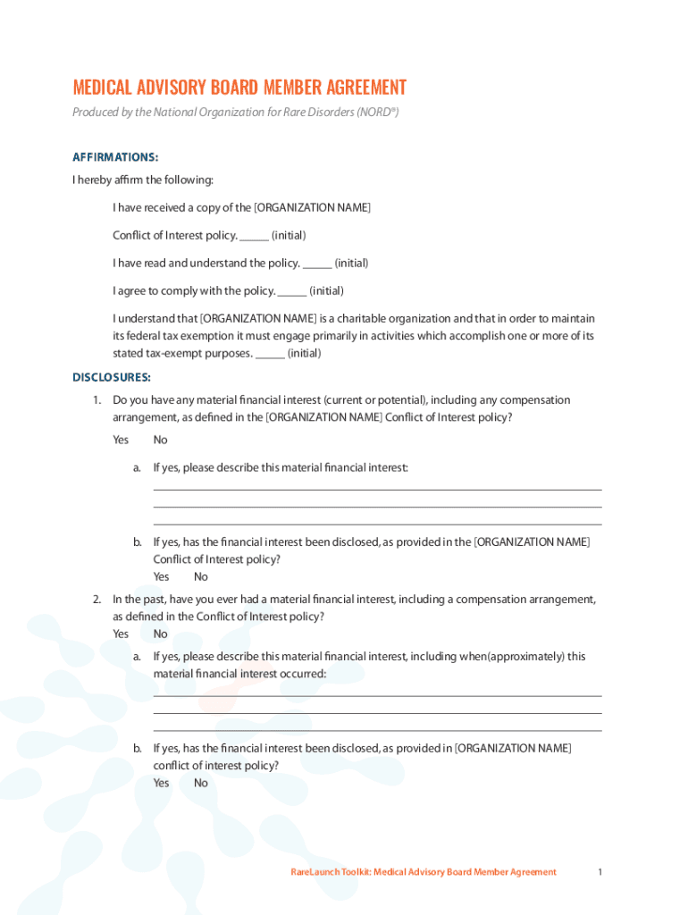MEDICAL ADVISORY BOARD MEMBER AGREEMENT Produced by the National Organization for Rare Disorders (WORD) AFFIRMATIONS: I hereby affirm the following:I have received a copy of the [ORGANIZATION NAME]Conflict