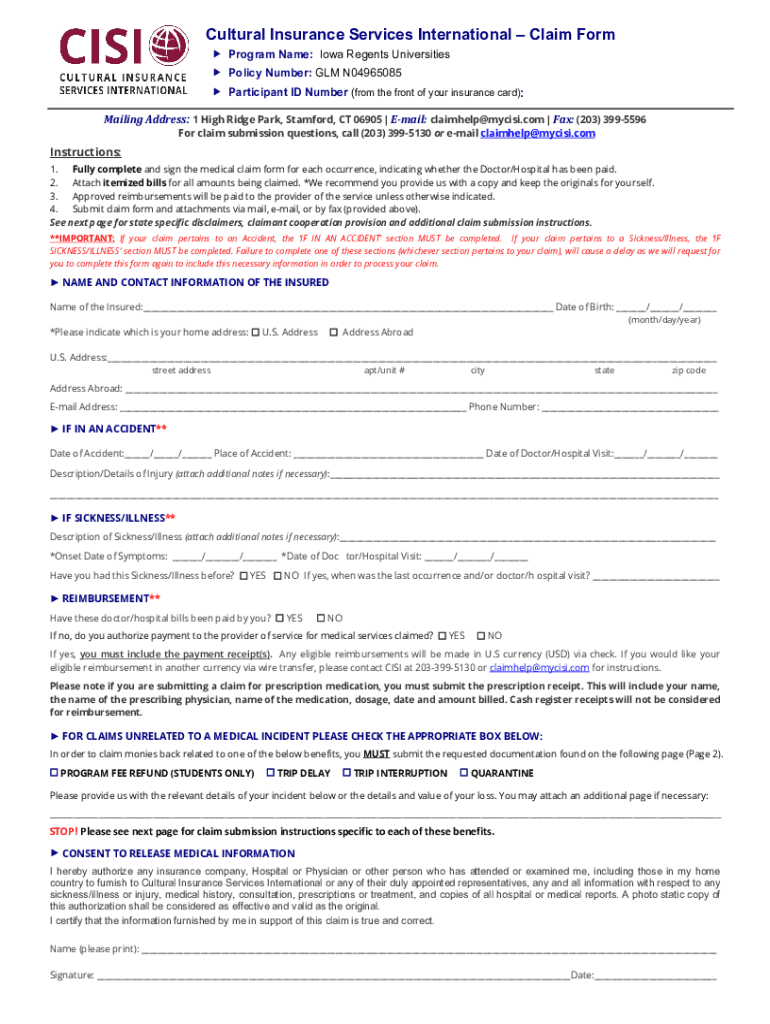 Cultural Insurance Services International Claim Form Program Name: Iowa Regents Universities Policy Number: GLM N04965085 Participant ID Number (from the front of your insurance card): Mailing Address: