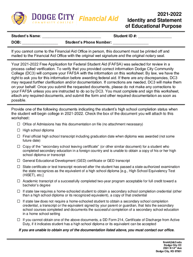 20212022 Identity and Statement of Educational Purpose Students Name: ___ DOB: ___Student ID #: ___Students Phone Number: ___If you cannot come to the Financial Aid Office in person, this document