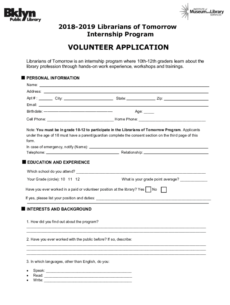 20182019 Librarians of Tomorrow Internship ProgramVOLUNTEER APPLICATION Librarians of Tomorrow is an internship program where 10th12th graders learn about the library profession through Hanson work