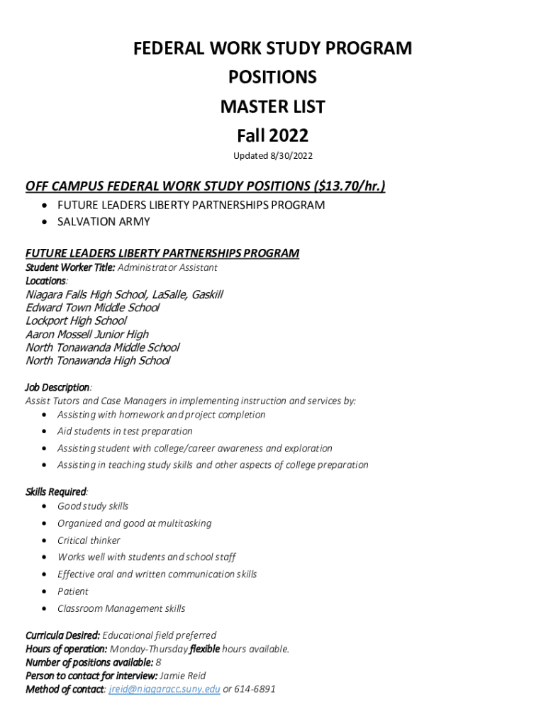FEDERAL WORK STUDY PROGRAM POSITIONS MASTER LIST Fall 2022 Updated 8/30/2022OFF CAMPUS FEDERAL WORK STUDY POSITIONS ($13.70/hr.) FUTURE LEADERS LIBERTY PARTNERSHIPS PROGRAM SALVATION ARMY FUTURE LEADERS