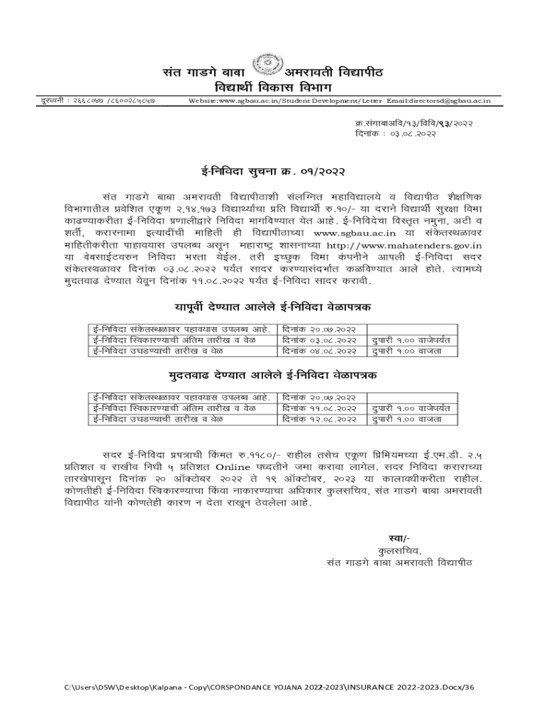 I Mm +i t` TL E M nix : 2668047 /8600285857Website:www.sgbau.ac.in/Student Development/Letter Email:directorsd@sgbau.ac.ING. M+/13//93/2022 née : 03.08.2022xn So G. 01/2022 i Mm +i t` Mix t.