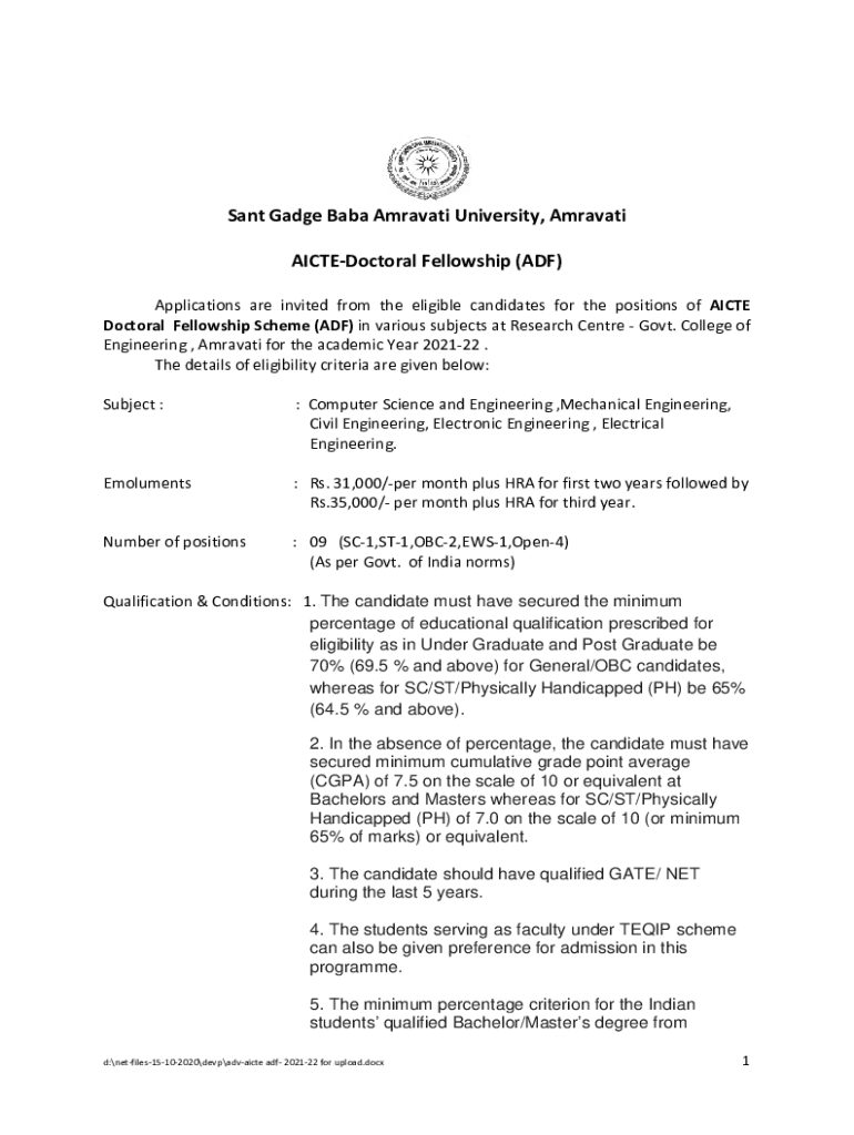 Sent Gauge Baba Amravati University, Amravati AICTEDoctoral Fellowship (ADF) Applications are invited from the eligible candidates for the positions of ACTE Doctoral Fellowship Scheme (ADF) in various