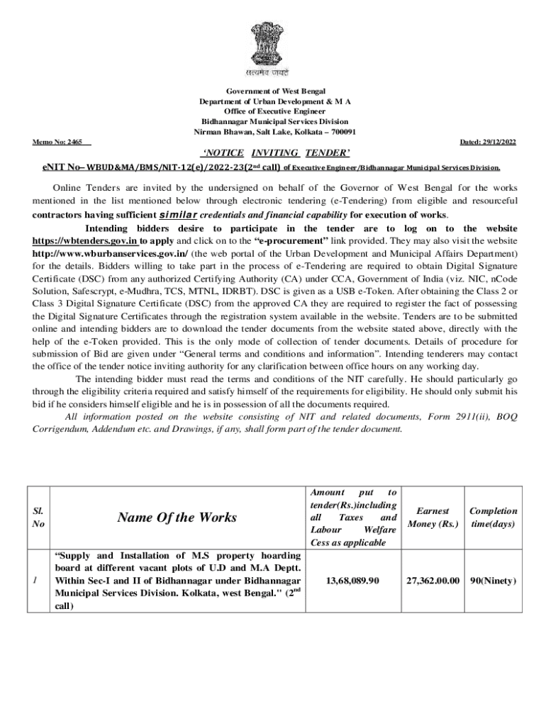 Government of West Bengal Department of Urban Development & M A Office of Executive Engineer Bhatnagar Municipal Services Division Norman Shawn, Salt Lake, Kolkata 700091 Memo No: 2465Dated: 29/12/2022NOTICE