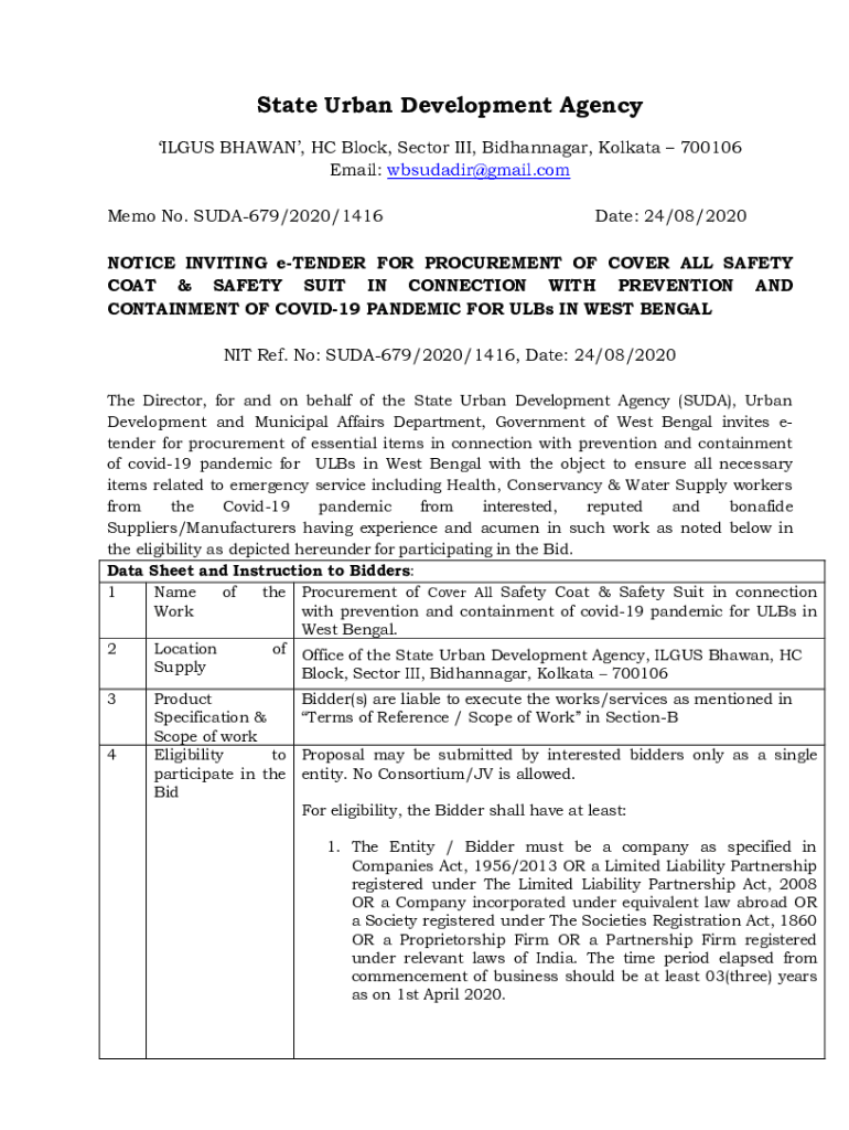 State Urban Development Agency ILLUS SHAWN, HC Block, Sector III, Bhatnagar, Kolkata 700106 Email: wbsudadir@gmail.com Memo No. SUDA679/2020/1416Date: 24/08/2020NOTICE INVITING tender FOR PROCUREMENT