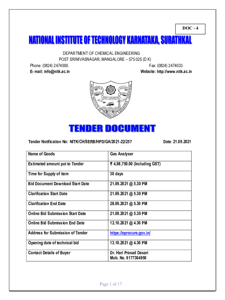 DOC 4DEPARTMENT OF CHEMICAL ENGINEERING POST SRINIVASNAGAR, MANGALORE 575 025 (D K) Phone: (0824) 2474000. Fax: (0824) 2474033 E mail: info@nitk.ac.in Website: http://www.nitk.ac.inTender Notification