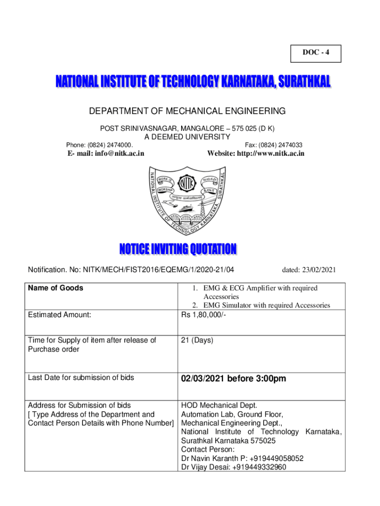 DOC 4DEPARTMENT OF MECHANICAL ENGINEERING POST SRINIVASNAGAR, MANGALORE 575 025 (D K)A DEEMED UNIVERSITY Phone: (0824) 2474000. E-mail: info@nitk.ac.inFax: (0824) 2474033Website: http://www.nitk.ac.inNotification.